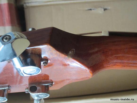 На грифе есть скол верхнего слоя лака. Слой очень тонкий, поэтому скол при игре не ощущается и не мешает.